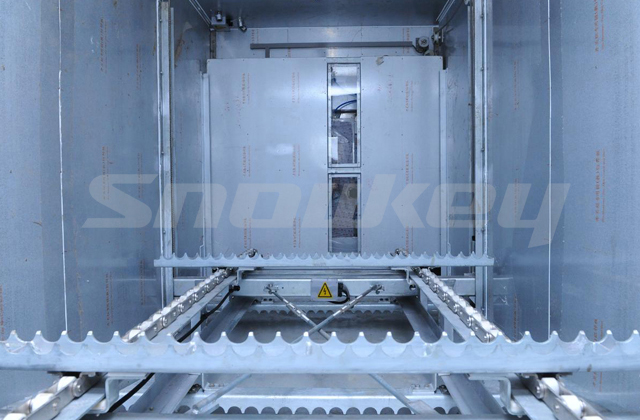 • 用于存储制冰机生产的冰。当用冰点在短时间内需要大量用冰的情况下,储冰库可以自动地输送冰,以满足用冰需求。储冰运转过程中,耙冰机构将制冰机制下来的冰在冰库水平范围内耙平,达到冰库存储的上限后,控制系统自动停止制冰机的运行。当冰库内的冰位较低时,又将自动启动制冰机。